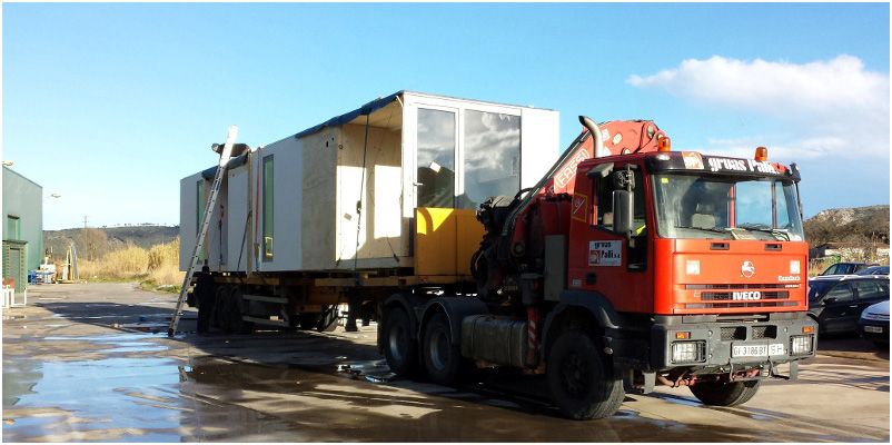 Una vez fabricados y apilados los módulos de paramentos verticales y horizontales que forman la envolvente del edificio, procederemos a cargarlos en camiones para transportarlos a la obra, donde la cimentación ya estará preparada para recibirlos.